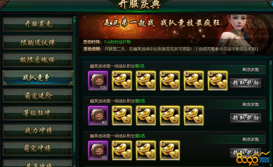 开服第二天,在幽冥战场中达到指定名次可领取。