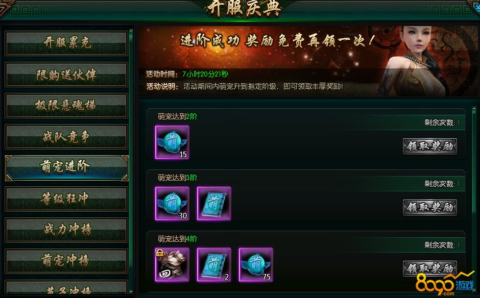 活动期间内萌宠升到指定阶级,即可领取丰厚奖励。