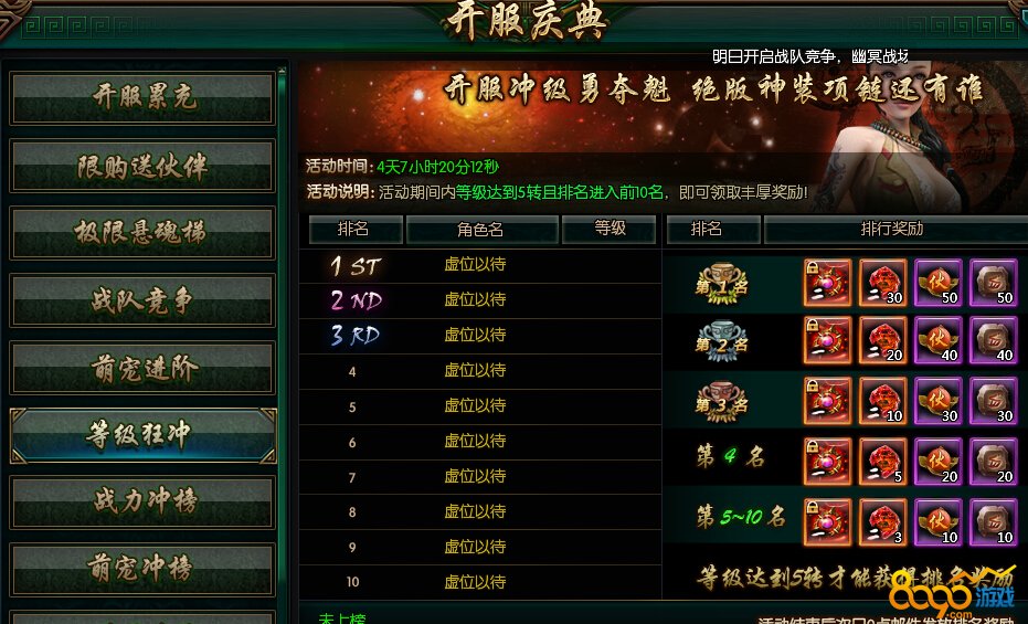 活动期间内等级达到5转且排名进入前10名,即可领取丰厚奖励。