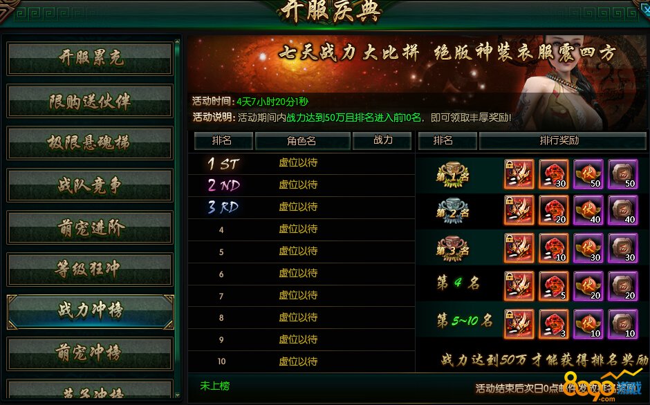 活动期间内战力达到50万且排名进入前10名,即可领取丰厚奖励