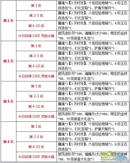 第三天:光翼幻化丹*1、披风魔符碎片*1、进阶血石*88