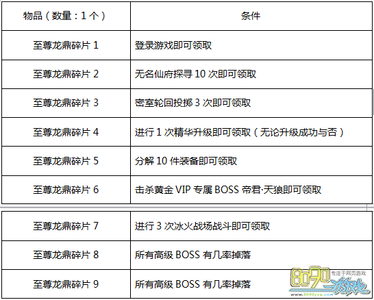 ² 至尊龙鼎一共9个碎片,每天可通过完成以下目标获得: