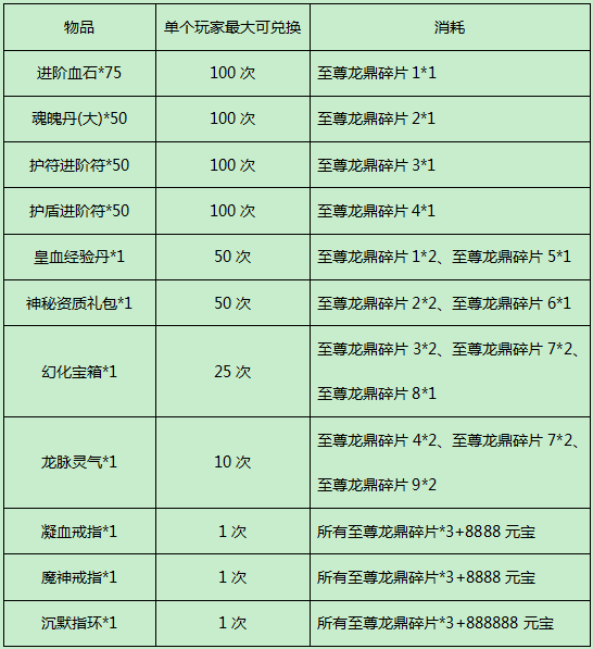 活动内容:活动期间,玩家可通过完成一系列的目标获得对应的至尊龙鼎碎片,获得碎片后玩家可在此活动中兑换各种奖励。