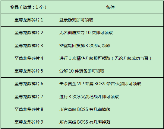 ² 至尊龙鼎一共9个碎片,每天可通过完成以下目标获得: