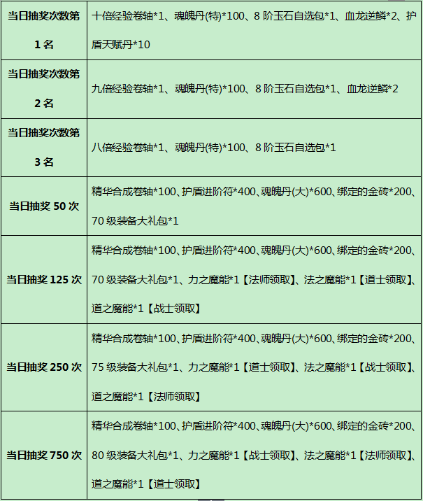 活动内容:活动期间,每天可花费元宝参与抽奖,每天单个玩家最多可参与5次,每次100元宝。每天首次参与可获得五倍经验卷轴*1、舒经活络丸*5,每天只能获得1次。次日0点开启大奖!