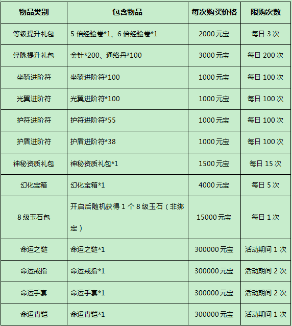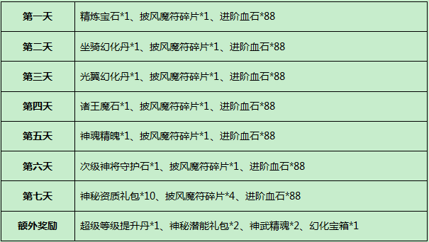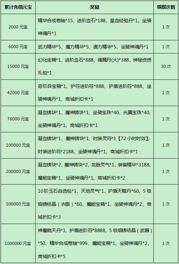 活动内容:活动期间内,每日充值1000元宝即可领取奖励,最后1天需要单笔充值10000元宝才可领取。连续7天达到指定充值金额还可领取额外奖励。