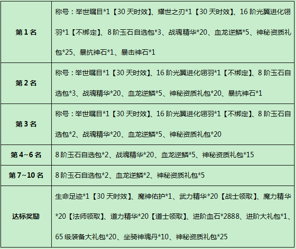 活动内容:活动结束后,举世瞩目活动排名前3的玩家将在登陆界面荣耀展示。
