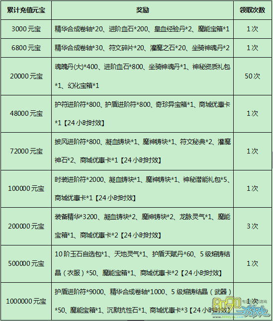 活动内容:活动期间内,玩家每日累计充值元宝数达到指定金额即可领取奖励。