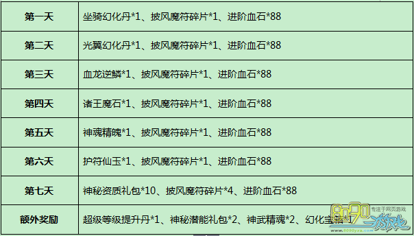 活动内容:活动期间内,每日充值1000元宝即可领取奖励,最后1天需要单笔充值10000元宝才可领取。连续7天达到指定充值金额还可领取额外奖励。