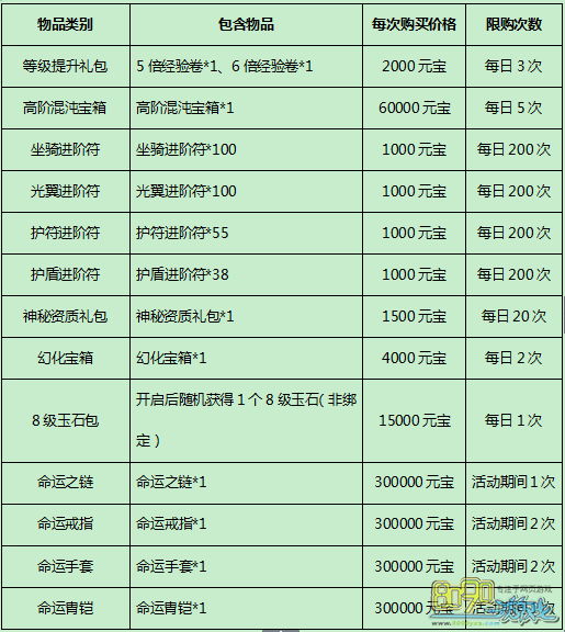 第7~10名:8阶玉石自选包*2、幻化宝箱*2、神秘资质礼包*5