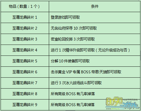 ² 至尊龙鼎一共9个碎片,每天可通过完成以下目标获得: