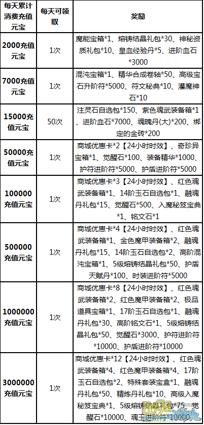 活动内容:活动期间内,每天累计消费一定额度充值元宝即可领取奖励。