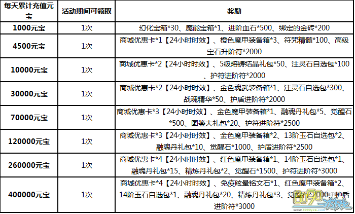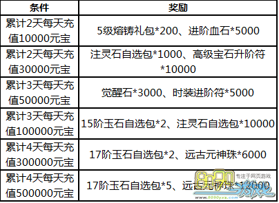 活动内容:活动期间内,玩家每天累计充值指定额度元宝即可领取奖励。