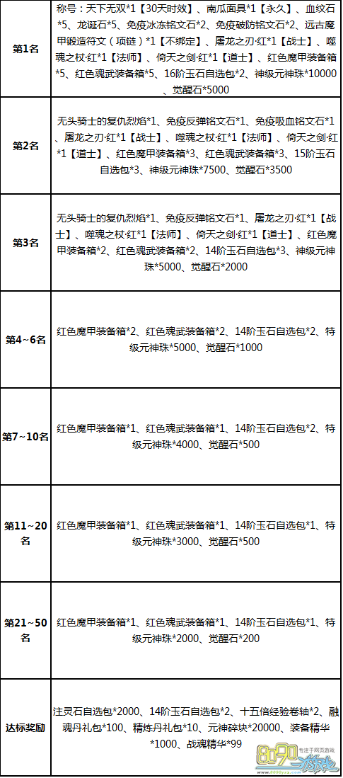 活动内容:活动期间内,累计消费200000充值元宝即有资格进入全平台排名,并领取达标奖励。活动结束后以邮件形式发放排名奖励,达标奖励需要手动领取。