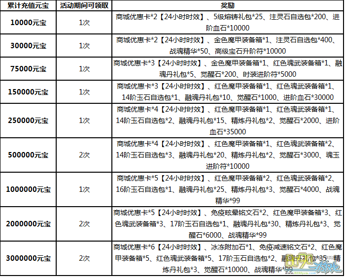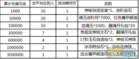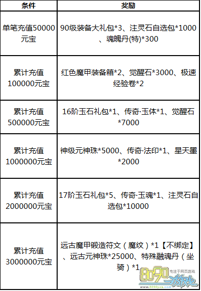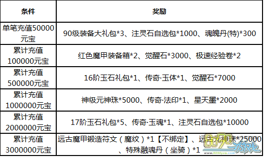 活动内容:活动期间内,玩家累计充值指定额度元宝即可领取奖励。