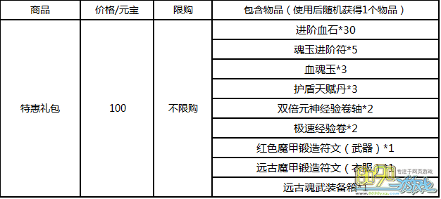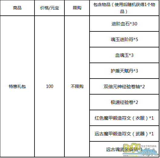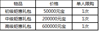 活动内容:活动期间内,可使用元宝购买特惠礼包。