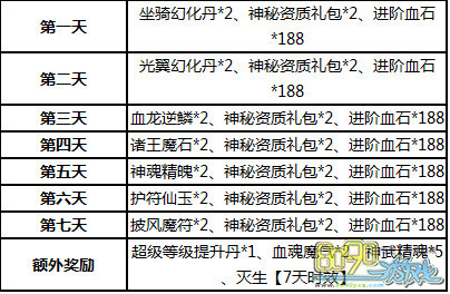 活动内容:活动期间内,每天累计充值5999元宝即可领取:神级经验卷轴*2、魔渊探宝券*2、神秘资质礼包*10、进阶血石*2000,每天累计充值19999元宝即可领取:神级经验卷轴*2、魔渊探宝券*10、入魔幻化丹*1、融魂丹礼包*2、血魂玉*200。