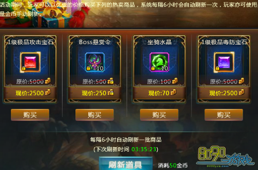 一、 限时折扣商店,活动期间,每隔半小时可刷新一次,可使用超低价格购买超值宝石、坐骑水晶道具等稀缺物品(每天不同种类折扣超优惠)