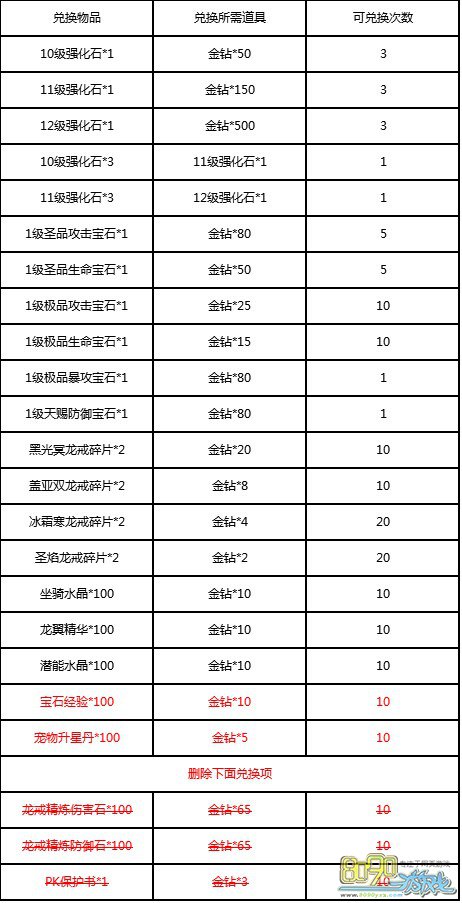 100000金币:金钻*200、11级强化石*1、1级天域防御宝石*1、逆鳞*8、龙核*8