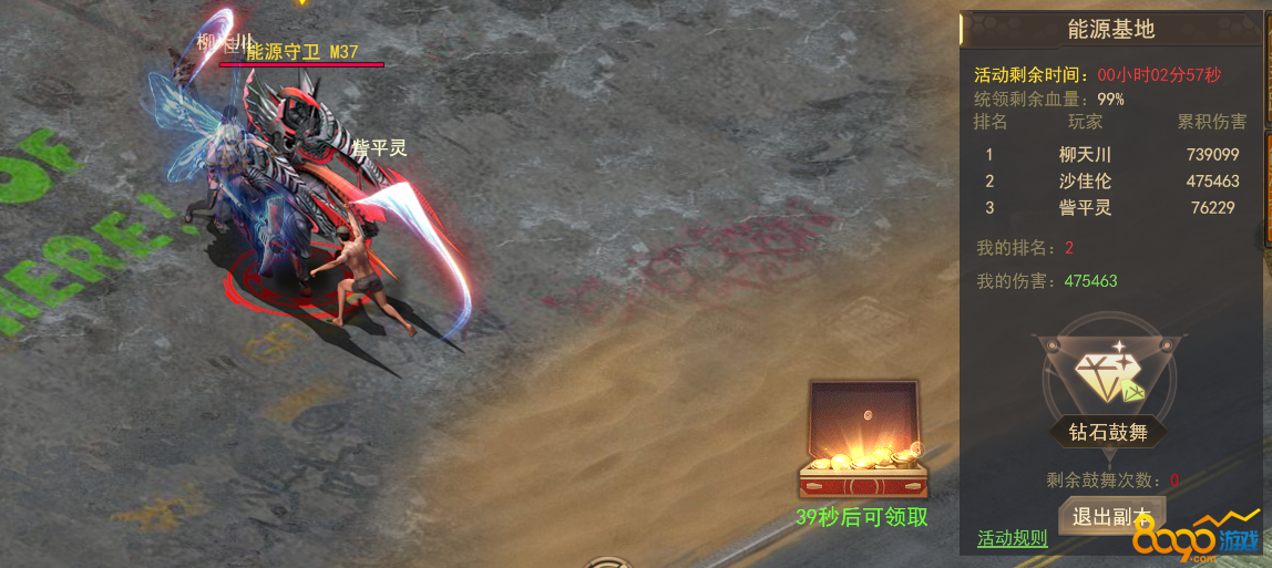 能源基地每日18点开启,活动根据伤害排名发放巨量金币奖励,对守护者伤害排名越高的玩家可获得越多的奖励;活动期间可消耗钻石进行鼓舞,每次鼓舞都可增加自身10%的属性,最多可鼓舞10次