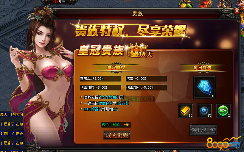 3、 贵族玩家还拥有进入安全挂机地图,一键完成渡魔任务并免费3倍领奖,增加2次BOSS提醒功能和领取贵族每日礼包的特权;