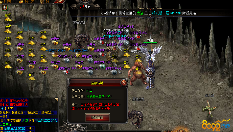 3、 活动开启时,系统将在新手村,兽人洞,毒蛇山谷,万虫窟,呙犸寺,祭祀神庙或镇妖墓中的任意一个位置刷出携带宝藏的盗贼,盗贼存活30分钟;