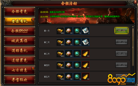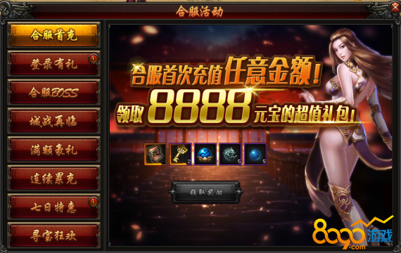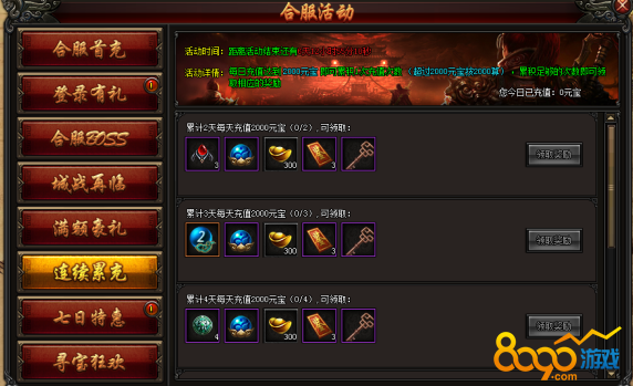 合服期间,每日充值达到2000元宝即可累积1次充值次数,累积足够的次数即可领取相应的奖励