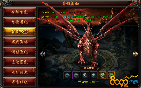 合服期间,将在每日的20:30的攻城区刷新一个BOSS,BOSS只停留30分,合服BOSS将掉落各个系统的所需的稀有材料