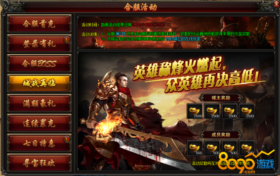 合服第3日开启合服后的首场城战,获胜的行会首领将能获得丰厚的元宝奖励