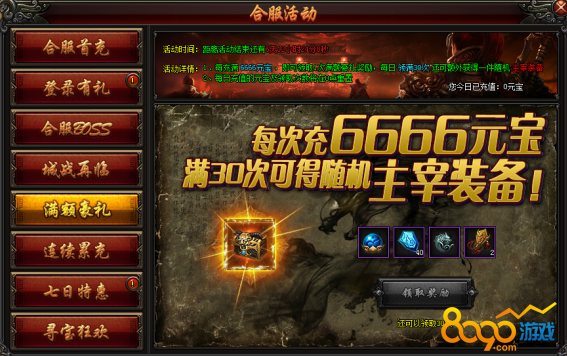 合服期间,每充满6666元宝即可领取一次奖励,领满30次还可额外获得一个随机部位的主宰装备