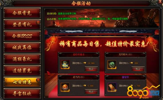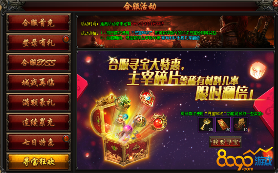 合服期间,寻宝获得主宰碎片等稀有材料几率翻倍;另外,每日首次使用“寻宝50次”功能,还可领取额外的奖励