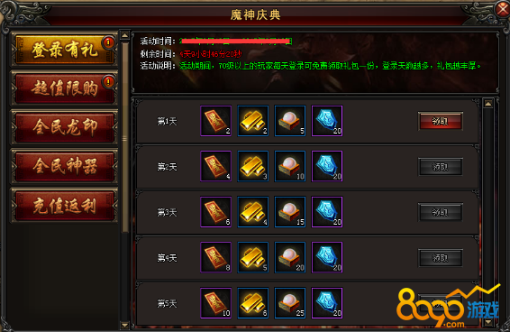 活动说明:活动期间,70级以上的玩家每天登录可免费领取礼包一份。登录越多,礼包越丰厚