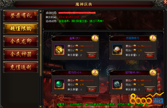活动说明:活动期间内,每日0点刷新特价珍贵道具。助您战力暴涨!超值道具,限时限量出售,错过不再有