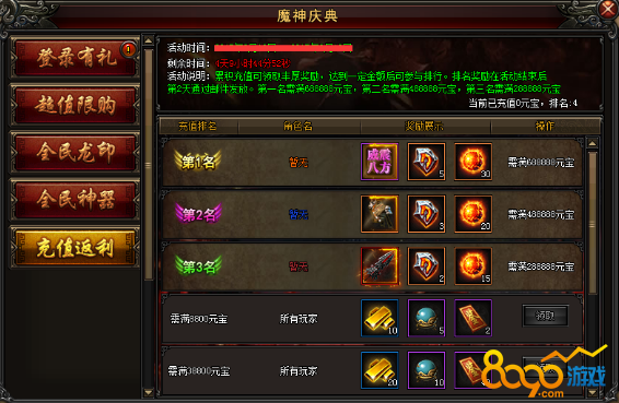活动说明:累计充值对应额度可领取丰厚奖励,达到一定金额后可参与排行。排名奖励在活动结束后第二天通过邮件发放。