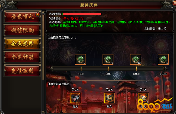 活动说明:活动期间,升级龙印,消耗龙印碎片达到一定数量,可以领取相应的龙印碎片奖励,使用碎片超过25000的可以参与龙印碎片排名奖励,活动结束后系统邮件发放排行奖励。