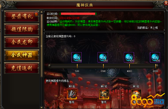 活动说明:活动期间,升级神器,使用神器提升丹达到一定数量,可以领取对应的神器提升丹奖励。使用神器提升丹超过8000,可以参与排名奖励。活动结束后系统邮件发放排行奖励。