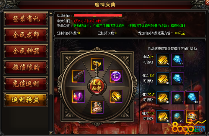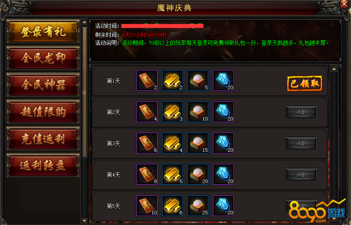 魔神庆典活动火爆开启,分别有登录有礼、超值限购、充值返利、全民龙印、全民神器、返利转盘六大庆典活动。