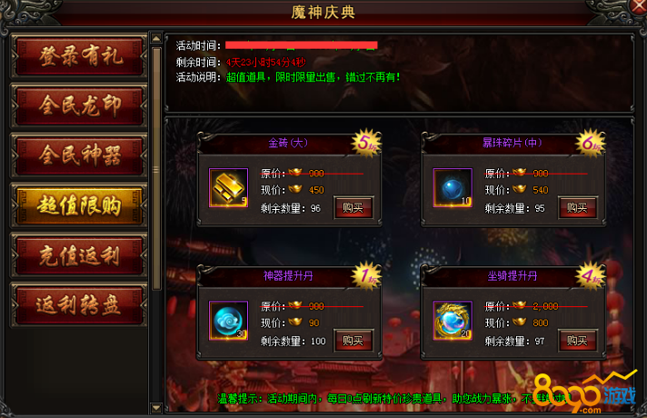 活动说明:活动期间内,每日0点刷新特价珍贵道具。助您战力暴涨!超值道具,限时限量出售,错过不再有