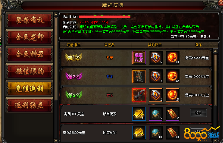 活动说明:累计充值对应额度可领取丰厚奖励,达到一定金额后可参与排行。排名奖励在活动结束后第二天通过邮件发放。