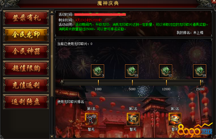 活动说明:活动期间,升级龙印,消耗龙印碎片达到一定数量,可以领取相应的龙印碎片奖励,使用碎片超过25000的可以参与龙印碎片排名奖励,活动结束后系统邮件发放排行奖励。