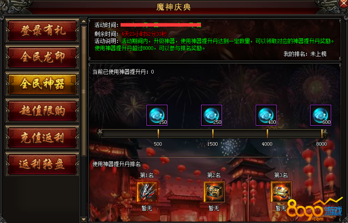 活动说明:活动期间,升级神器,使用神器提升丹达到一定数量,可以领取对应的神器提升丹奖励。使用神器提升丹超过8000,可以参与排名奖励。活动结束后系统邮件发放排行奖励。