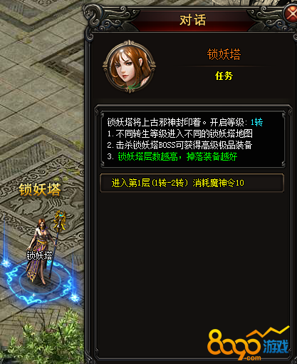 锁妖塔,1转后开启。玩家根据本身的转数进入相应的层数挑战BOSS。