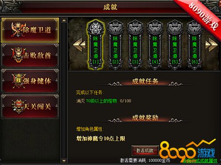 8090魔神是一款以仙侠魔幻为背景的即时PK网页游戏,熟悉的玩家都知道,在撸boss,刷装备,打皇城的基础上加入人物转职,战宠培养的多元素玩法,力求带给玩家创造一个更公平更好玩的游戏世界。游戏中的成就系统就是玩家能够证明自己的有力证明。