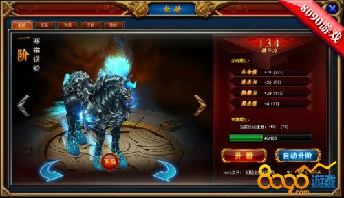 坐骑还可穿戴装备,可以为坐骑属性提供百分比加成。玩家使用道具可提升坐骑装备等级,等级越高,加成百分比越明显。当坐骑升阶到一定阶数后,玩家消耗金币可对坐骑属性进行洗炼,提升坐骑属性品质。游戏中坐骑除了有普通的升阶皮肤外,还可激活特殊神骑皮肤,除华丽酷炫的外表外,还将获得强力的额外属性加成。