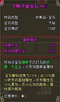 未解封前的十阶天钻宝石镶嵌后的附加物理攻击为452点,解封后的的十阶天钻宝石名称修改为:十阶天钻宝石-10%。10%为宝石解封的进度,可使宝石原属性的10%转变成基础属性,可受属性百分比累加,百分比加成越高,属性提升越高。