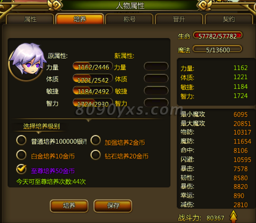 战斗力到8W,打开人物界面选择培养,使用钻石培养,如果属性提高多则选择保存,否则不要保存,战力到这个阶段后钻石培养基本已经饱和了,我们只有选择至尊培养。