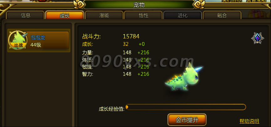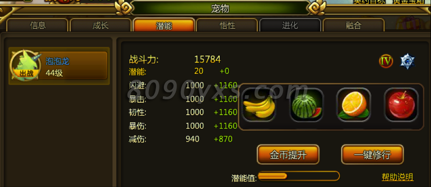 宠物成长界面中,使用完免费提升和道具提升机会后,使用金币进行提升,当金币消耗量大于20/次时停止使用。
