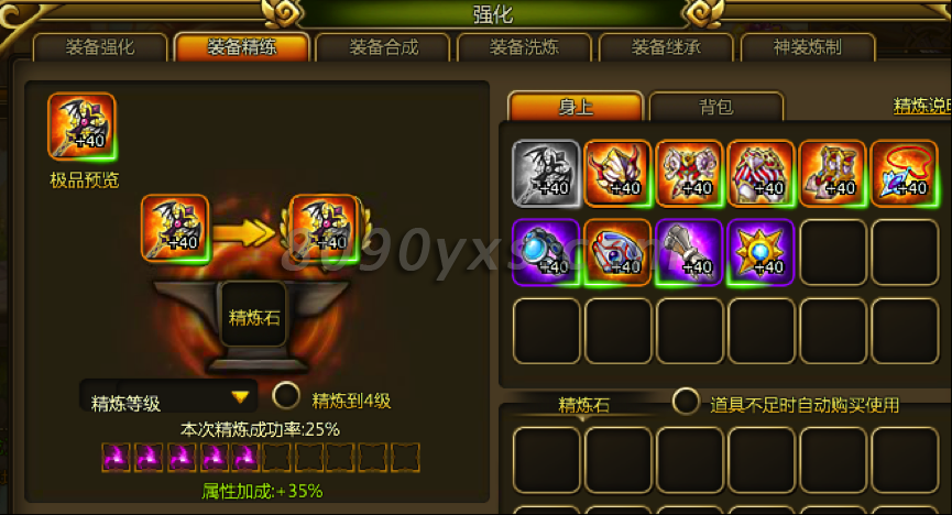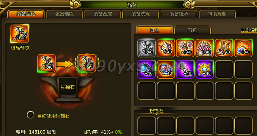 在等级到达45级时,礼包可以开出两件橙装,有人会问新的橙装怎样继承原来装备的强化等级和属性呢?只要在装备继承中将新装备的属性选择继承旧装备即可。在装备强化界面中将所有的装备强化至40,因为只有强化至40才可以领取橙装,如果在强化过程中发现有困难,可购买祝福石提高强化成功几率。