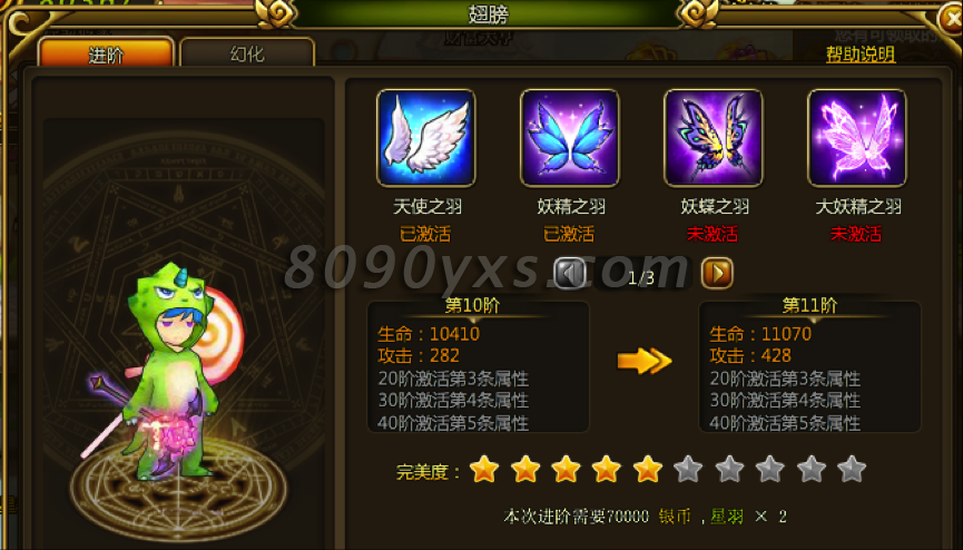 在翅膀界面中利用礼包和充值赠送的星羽进行升级,不建议大量购买星羽,因为成功率太低。这边我终于将翅膀进阶到了十阶,也就是妖精之羽。