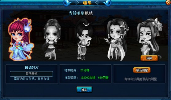 老汉推车活动全天24小时开启,每天每人都有10次抢夺与被抢夺的机会。每辆车上必须先坐上一个美女,越漂亮的美女,奖励越丰厚,每一辆车最多可被抢夺2次,劫车成功后玩家可以得到荣誉和古钱等奖励。